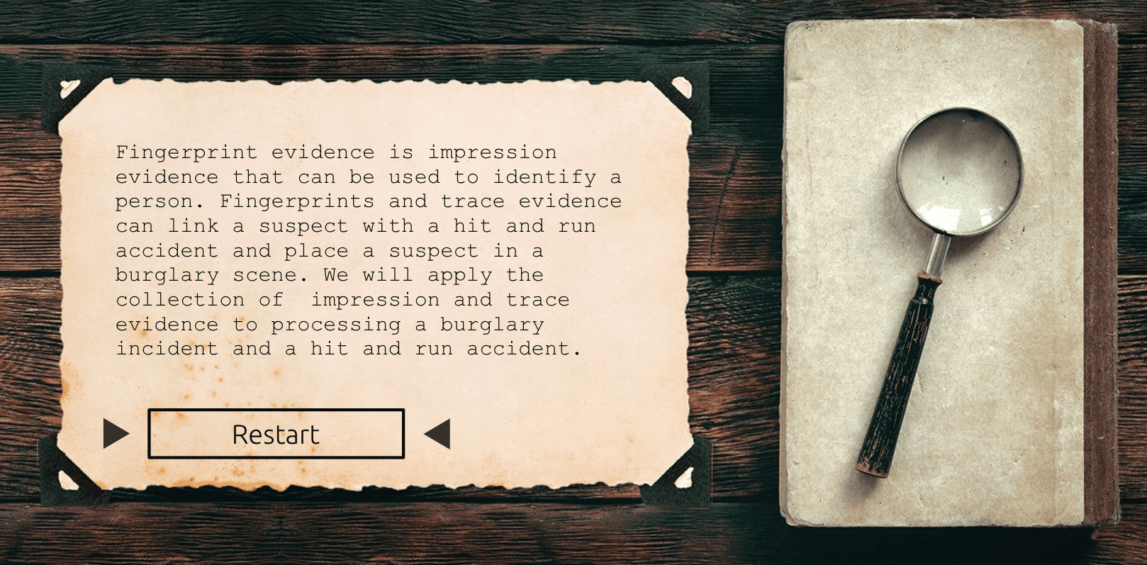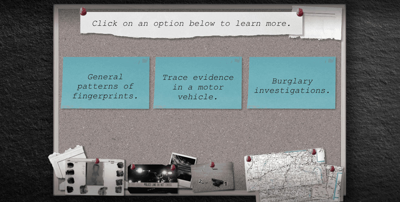 This applied criminology course focuses on forensic methods, investigative reasoning and challenges that an investigator would face on the field. It was designed with a visual novel style in mind and designed with explicit emphasis on meeting ADA accessibility standards.